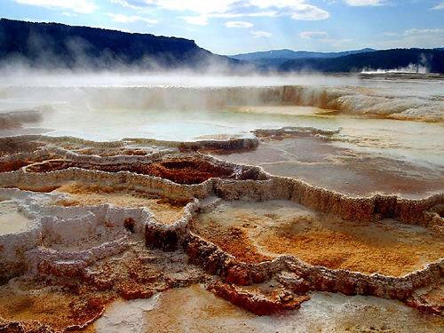 美国黄石公园猛犸温泉位于美国黄石公园猛犸温泉(Mammoth Hot Springs),是世界上已探明的最大的碳酸盐沉积温泉。它最显著的特点当属米涅瓦阶地,那是几千年来冷却沉淀的温泉水所形成的一连串阶地。