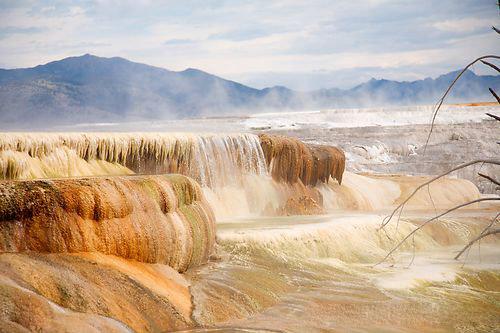 可惜的是,2002年的一次地壳变动,使得猛犸的大部分热泉都不再流,死掉的细菌变成灰白色的粉末,残留在乾枯了的大台阶上,反射着耀眼的阳光,将这里变成一片肃刹的不毛之地,让我们这些2009年才来参观的游客,顿觉可惜!这张照片是现存唯一一个规模稍大的活泉Pallete Spring。然而即使Pallete Spring的规模也只有原来的一小半了。